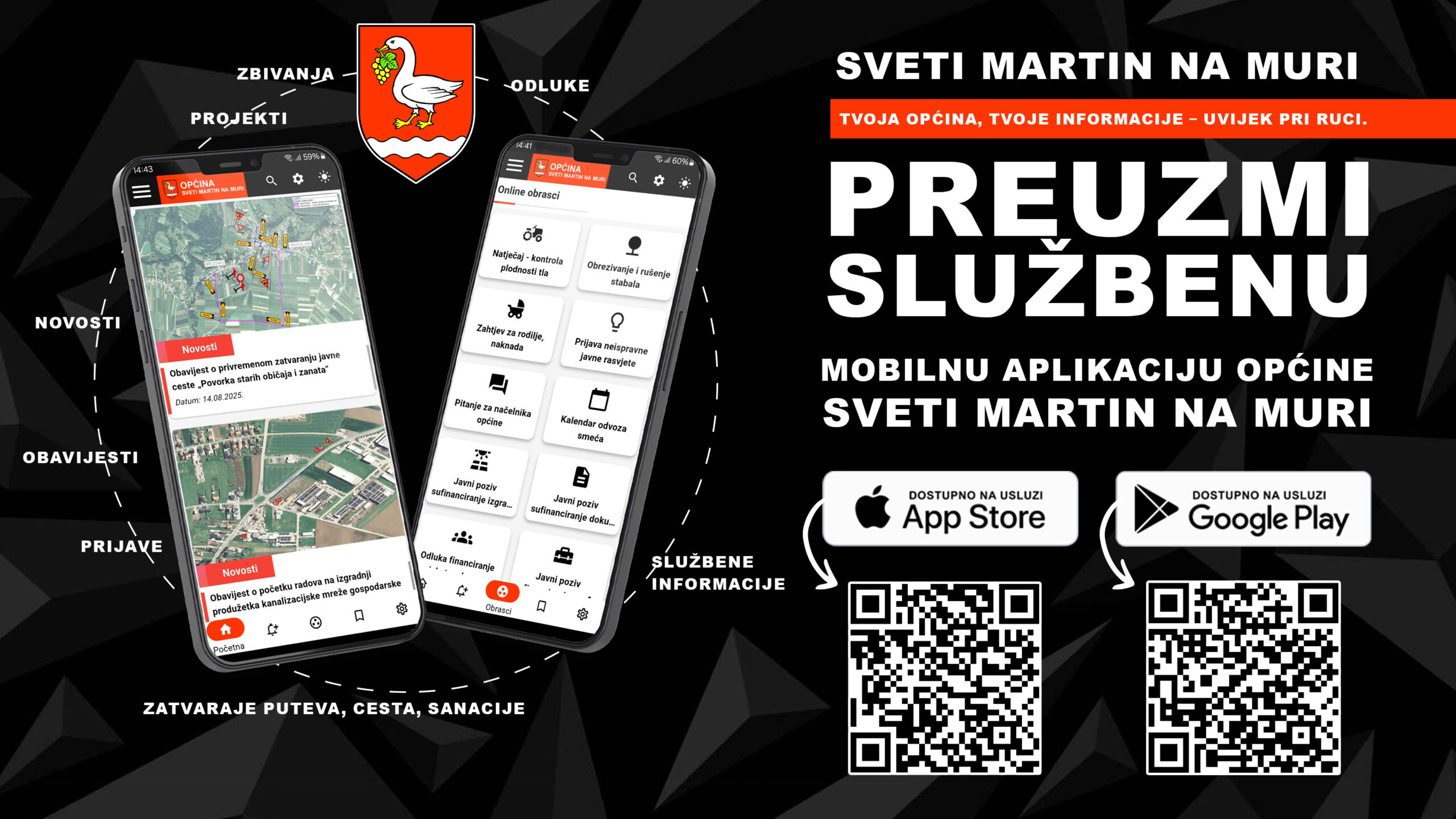 Uz novu mobilnu aplikaciju Sveti Martin na Muri, sve najvažnije informacije o našoj općini sada su vam nadohvat ruke — brzo, jednostavno i uvijek ažurno.